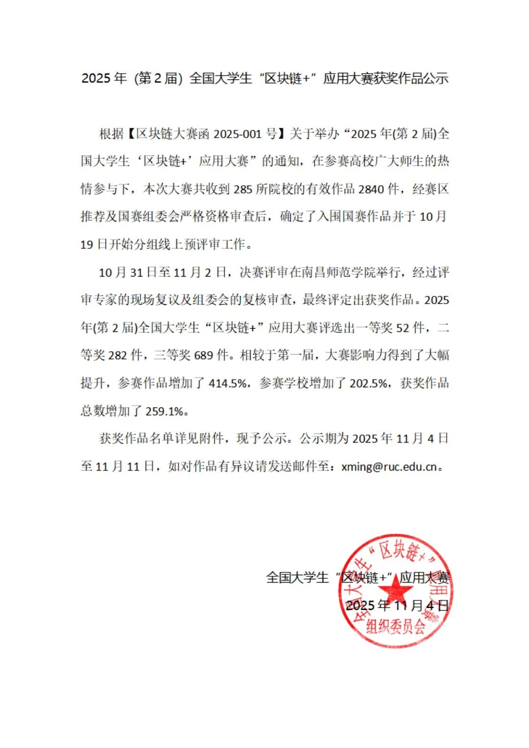 2025年(第2届)全国大学生“区块链+”应用大赛获奖作品公示