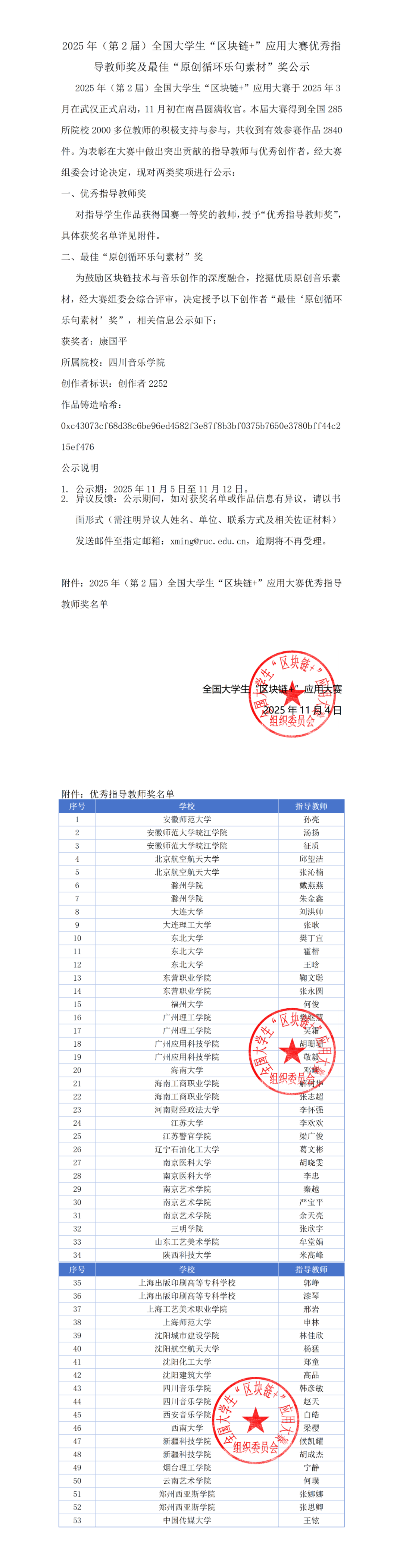 2025年(第2届)全国大学生“区块链+”应用大赛优秀指导教师奖及最佳“原创循环乐句素材”奖公示